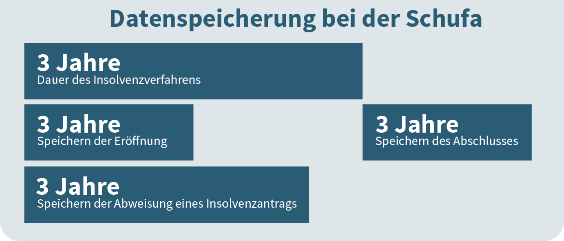 Die Eröffnung einer Verbraucherinsolvenz wird für drei Jahre gespeichert. Falls der Insolvenzantrag abgewiesen wurde, wird dies ebenfalls für drei Jahre gespeichert.